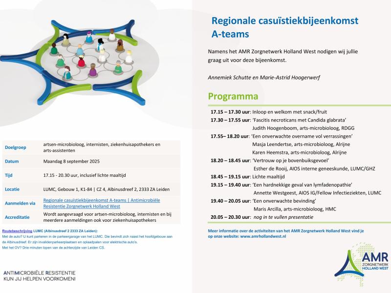 Graag nodigen we jullie uit voor de Regionale casuïstiekbijeenkomst A-teams op maandag 8 september 2025 (17:15-20:30 uur) in LUMC, Leiden....